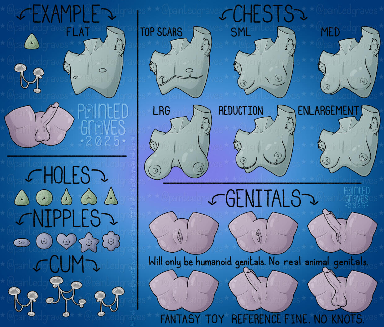 | Won't Do : | Pregnancy Art in Any Form (fetish, announcement, etc.), Feral Genitalia (no dog dick, horse cock, etc.) Knots, Minor / Underage Characters, Abuse of Any Form, Suicide, Hate Towards Any Minority Group, Feeder / Vore Fetish Art, Big Muscles, Hyper-exaggerated Bodies, Pokémon NSFW, My Little Pony NSFW, DDLG / DDLB / ABDL, Age Regression, Proship / Dead-Dove Content, Vehicles, Firearms, Foot Fetish Content, Bootlicker / MAGA / Conservative Propaganda, Detailed Gore |